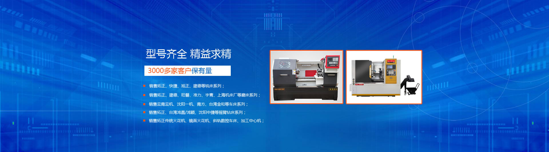 • 銷售拓正、快捷、旭正、建德等銑床系列;銷售拓正、建德、旺磐、準力、宇青、上海機床等磨床;銷售云南云機、沈陽一機、南方、臺灣金和等車床系列銷售拓正、臺灣鴻昌/鴻穎、沈陽中捷等搖臂鉆床系列;銷售數控雕銑機、火花機、加工中心機、中走絲線切割等。